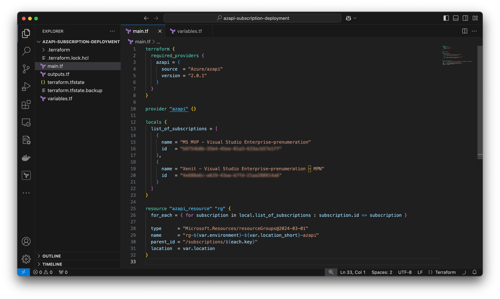 Introducing the AzAPI provider into the mix! Any azapi_resource accepts a property called parent_id which I intend to loop over. So I have defined my two different subscriptions here in a locals block that I can use to add and remove subscriptions to and this will ensure this one singular resource block gets deployed to each subscription, essentially granting me control over several subscriptions with just one provider block.