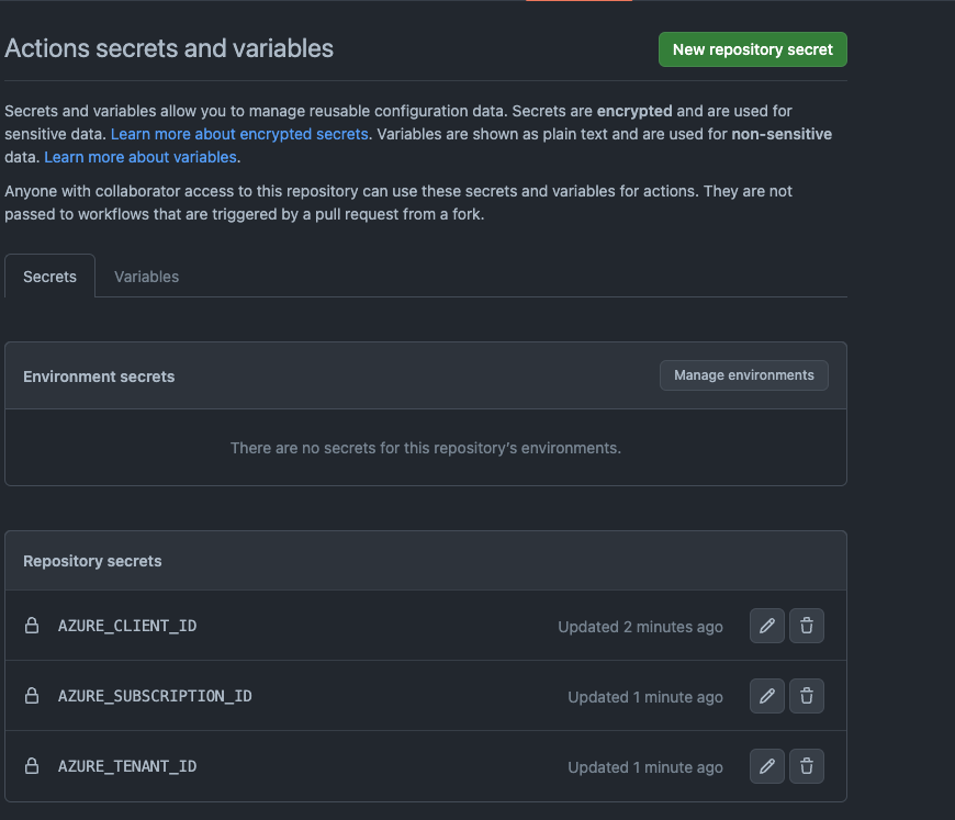 Here you want to select New repository secret & create three secrets using the outputs you received from the above commands in your terminal. Your finished configuration should look similar to this: