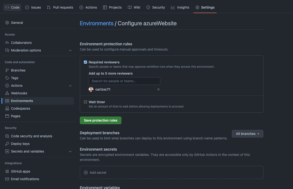 We can configure an extra step in our workflow that will require one or more reviewers to check that output from our what-if that we will soon create, to add an extra layer of quality control. In your github repository create a new environment and check the box for required reviewers, like I have here: