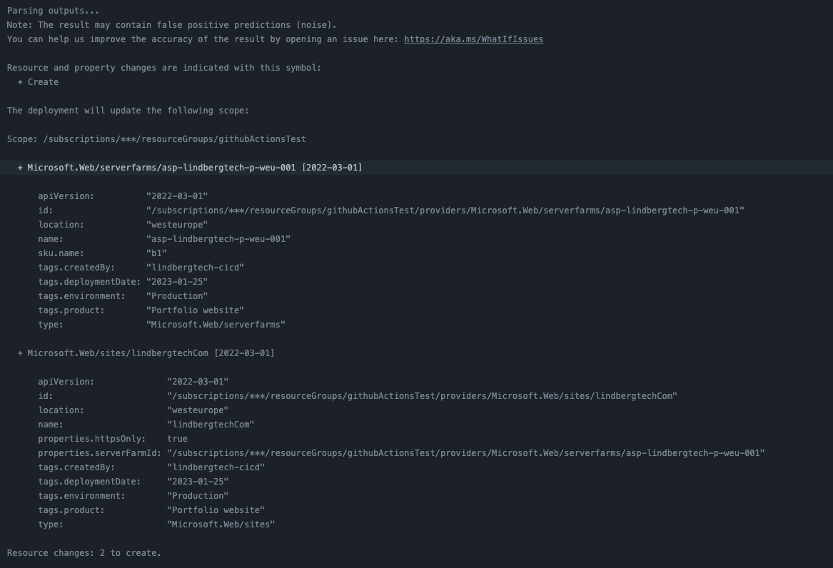 When preview finishes we can see the what-if output in this Github Actions step: