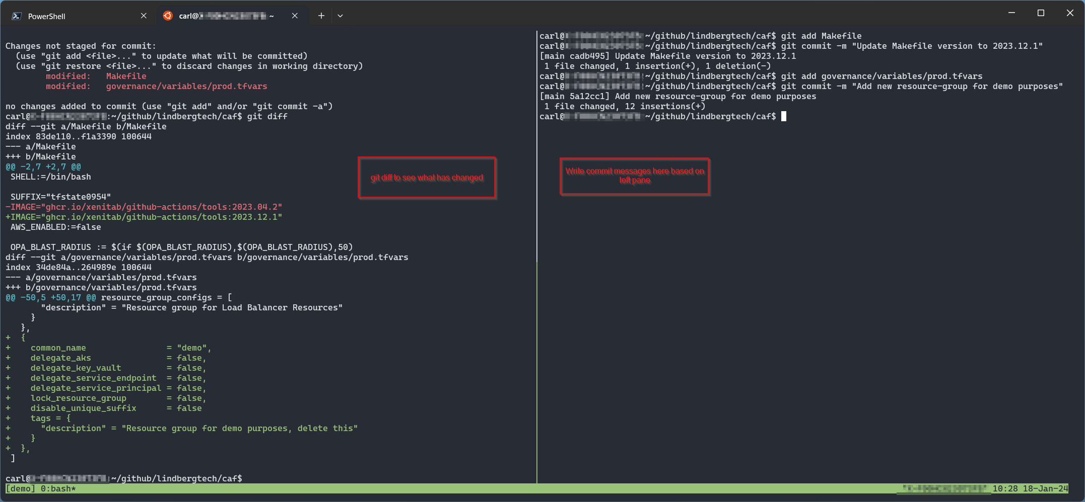 code . - In here I will make some changees to my Terraform configuration files because I wish to create a new resourcegroup in my Azure Environment that will host some new resources for me. I will interact with git on the left pane and az CLI & terraform on the right pane, it is just how I like to do it: